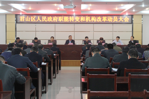 3月3日,君山区人民政府职能转变和机构改革动员大会召开。区委书记杨昆强调,政府职能转变和机构改革,是推动转型发展的迫切需要,是全面深化改革的重要内容,要按照市委、市政府的统一要求部署,在本月底前完成我区的机构改革工作。区委副书记、区长谢胜作动员讲话,会议由区委副书记余为主持,区委常委、常务副区长万东宣读了《区委区政府关于君山区人民政府职能转变和机构改革的实施意见》,区委常委、纪委书记罗遥宣读了《关于严明纪律确保政府机构改革工作顺利进行的通知》。区领导杨培菊、李志文、朱彦翼参加。