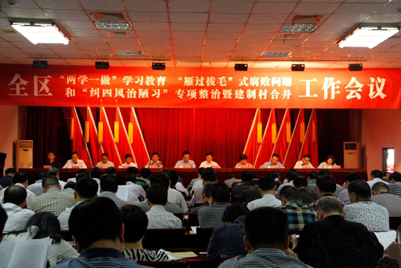 5月13日,全区“两学一做”学习教育、“雁过拔毛”式腐败问题和“纠‘四风’、治陋习”专项整治暨建制村合并工作会议召开,区委书记杨昆强调这三项工作要有序推进,为全区营造一个风清气正的良好环境。区委副书记、区长谢胜做总体安排部署,区委副书记余为主持,区委常委、纪委书记罗遥,区委常委、组织部长、统战部长朱彦翼,区委常委、副区长姜佳莉分别就各自分管工作作动员讲话,全体在家区级领导及各单位相关负责人参加。
