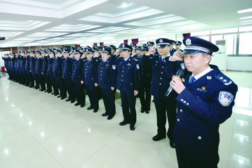 1月1日上午,省公安厅特勤局隆重举行集体换装暨入警宣誓仪式。根据党和国家机构改革有关精神,公安警卫部队不再列武警部队序列,全部退出现役。昔日身着戎装的武警警卫官兵,今朝换装警服,成为公安特勤干警。至此,我省公安警卫部队改制工作如期圆满完成。(记者 罗新国 摄)