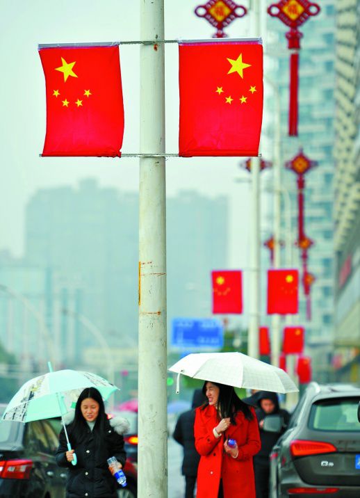 1月4日,长沙市开福区湘江中路,市民从鲜红的国旗下走过。新年伊始,长沙市区主要道路两侧都悬挂国旗,营造喜庆气氛,激发市民爱国热情。