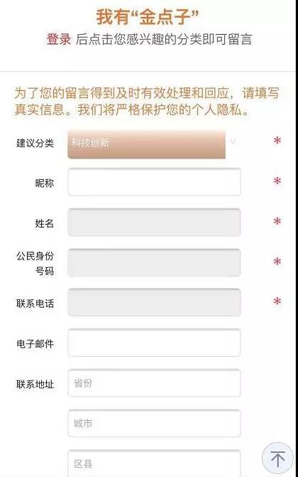 打开金点子→选择建议分类→填写真实信息→完成提交