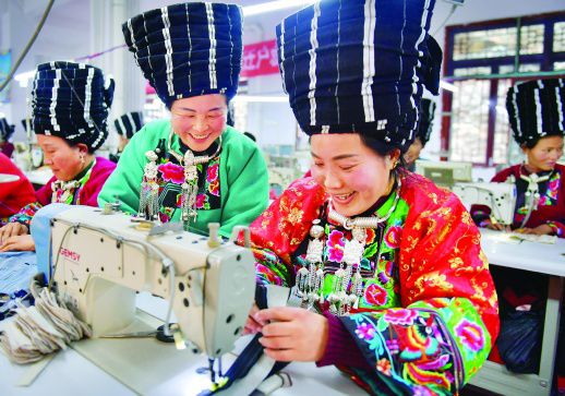 1月23日,凤凰县禾库镇易地扶贫搬迁安置区,苗族搬迁户在参加同康民族服饰有限公司的岗前就业技能培训。去年来,该镇为让搬迁贫困户“搬得出、稳得住、能融入、能致富”,通过实施“一户一人就业”等保障项目,就近提供就业岗位1000多个,确保搬迁户收入稳定,生活有保障。湖南日报记者 郭立亮 通讯员 孙珂 摄影报道