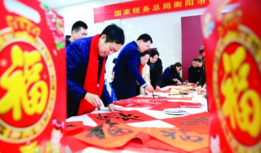 1月25日,衡阳市税务局开展“您为国纳税,我为您送福”活动,邀请书法家来到雁峰区税务局办税大厅,为前来办税的市民书写福字、春联,送上春节的祝福。欧阳郁婕 郑潮平 摄影报道