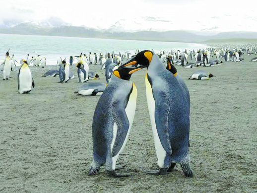 硕大的滩涂有两个足球场那么大,竟站满了王企鹅。有的一家三口,和和美美;有的新婚燕尔、耳鬓厮磨;有的小夫妻还带着姨妹子或闺蜜。
