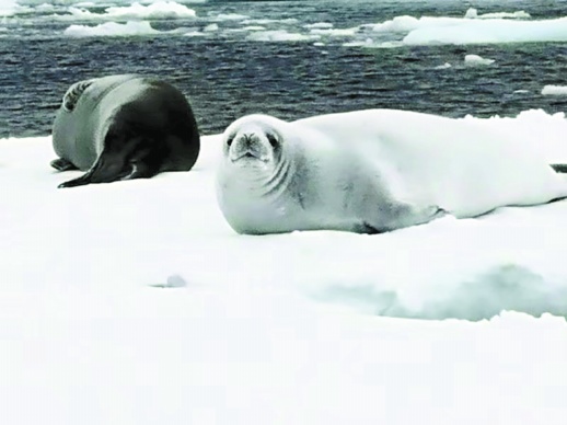 斑海豹、毛皮海豹在浮冰上休憩。冲锋舟驶抵它们面前了,它们才好奇地打量来人一眼……
