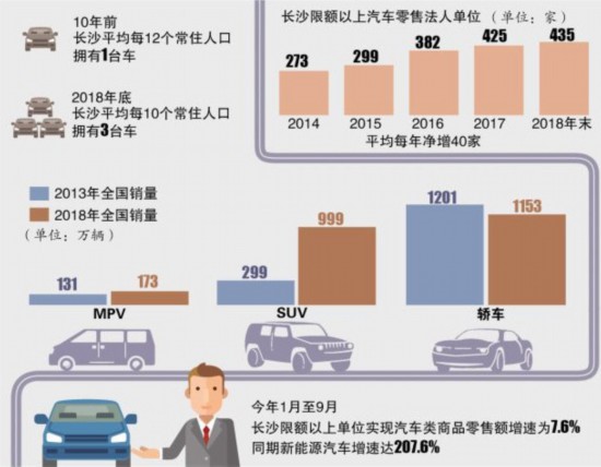 10年前,长沙平均每12个常住人口拥有1台车,汽车仅是少数家庭才拥有的消费品;2018年底,长沙平均每10个常住人口已拥有3台车,即三口之家共同使用一台汽车,可以说汽车的使用已经普及到千家万户。