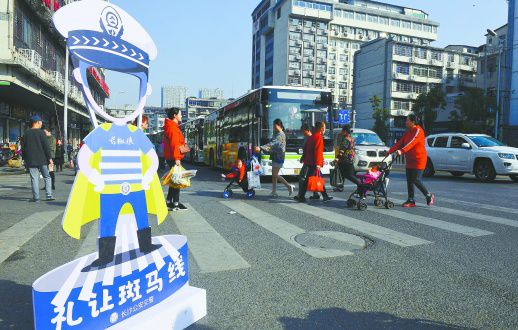 11月22日,长沙市书院路碧湘街路口,“长椒侠”在提醒过往车辆礼让行人。当天是长沙市“礼让日”,长沙交警在全市开展不文明交通行为的整治,倡导交通参与者文明礼让出行。长沙交警卡通形象“长椒侠”正式亮相城区主要斑马线路口,与交警一同守护斑马线上的文明。(记者 徐行 摄)