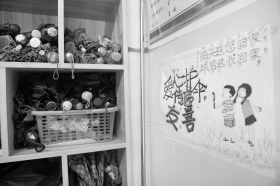 12月20日,长沙天心区南大桥小学,老人送来的爱心伞被放置在门卫室的柜子上。 图/记者金林 南大桥小学学生画的老人送伞漫画。
