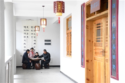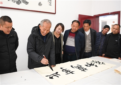 12月18日,82岁的村民颜克仁(左二)在活动中心书画室写字,其他村民跃跃欲试。