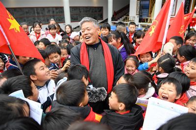 12月19日,老农活动中心,谭谈为小学生送上课外书籍,孩子们十分开心。