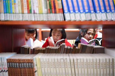 12月18日,放学后的小学生在晚晴书屋看书。书屋的1万余册图书,均系谭谈的作家朋友捐赠。