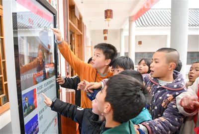 12月18日,放学后的小朋友通过新湖南新闻大屏看新闻。