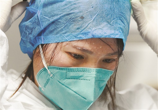 2月10日,嘉禾县人民医院检验科, 连续工作6个小时的曾梅卸下护目镜、防护帽,豆大的汗珠挂在眉头、脸上。 黄春涛 摄