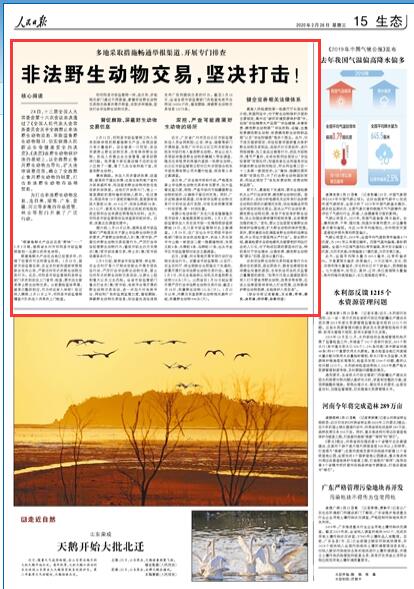 24日,十三届全国人大常委会第十六次会议表决通过了《全国人民代表大会常务委员会关于全面禁止非法野生动物交易、革除滥食野生动物陋习、切实保障人民群众生命健康安全的决定》。《决定》在野生动物保护法的基础上,以全面禁止食用野生动物为导向,扩大法律调整范围,确立了全面禁止食用野生动物的制度,打击非法野生动物市场和贸易。