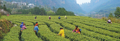 3月11日,湖南省张家界市武陵源区协合乡黄家坪村,贫困户鲁春英等茶农在家门口的百丈峡茶园采摘初春头茶。孙 超 邓道理摄影报道