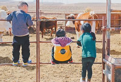 3月14日,宁夏海原县西安镇养殖脱贫户李成海的养牛场,引来好奇的孩子们。本报记者 禹丽敏摄
