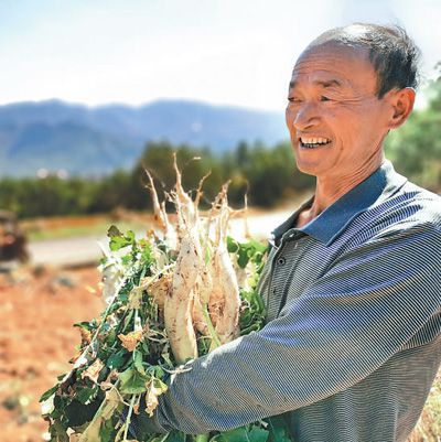 3月12日,云南省宣威市杨柳镇可渡村贫困户詹显波在采收萝卜。除了务农,詹显波还在当地的扶贫基地务工。李茂颖 赵新平摄影报道