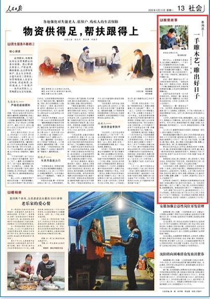 边带徒弟,边练技艺。奉湘波先后获得湖南省及全国残疾人技能比赛的大奖,被评为技术能手。在一块色泽灰暗的木墩上,刻刀上下翻飞,刀起刀落,木材特有的清香扩散,图案慢慢呈现。奉湘波给我们展示了一下精湛的技艺。