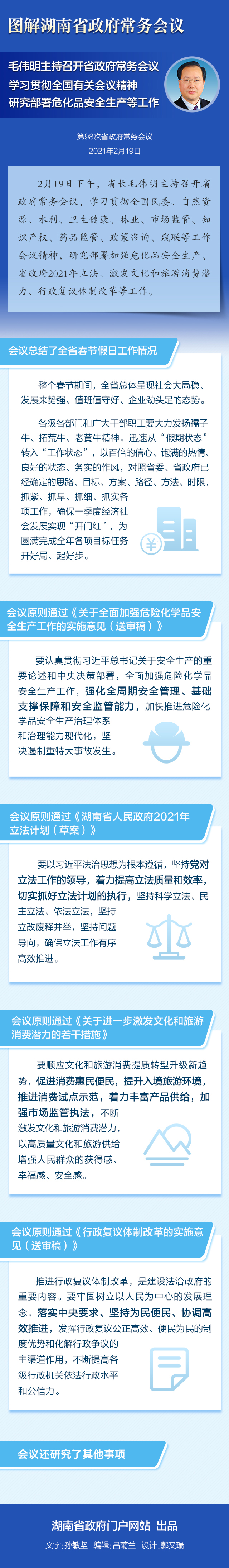 2月19日下午,省长毛伟明主持召开省政府常务会议,学习贯彻全国民委、自然资源、水利、卫生健康、林业、市场监管、知识产权、药品监管、政策咨询、残联等工作会议精神,研究部署加强危化品安全生产、省政府2021年立法、激发文化和旅游消费潜力、行政复议体制改革等工作。
