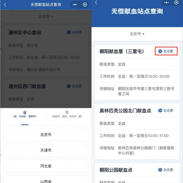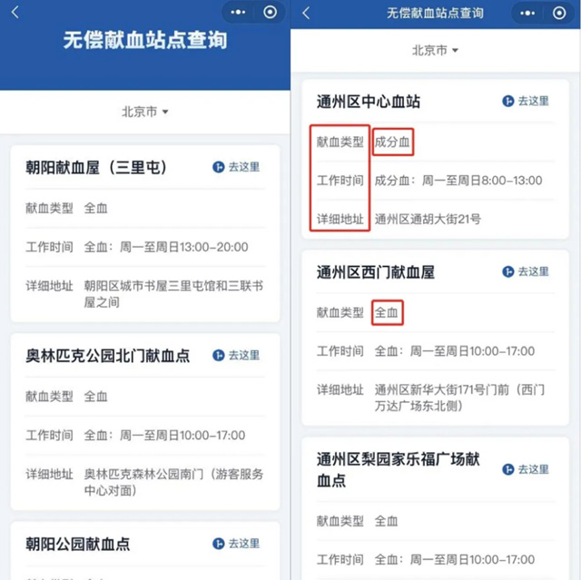 在这里就能看到所在城市的无偿献血站点,献血类型(全血/成分血)、工作时间、详细地址都为你罗列清楚!