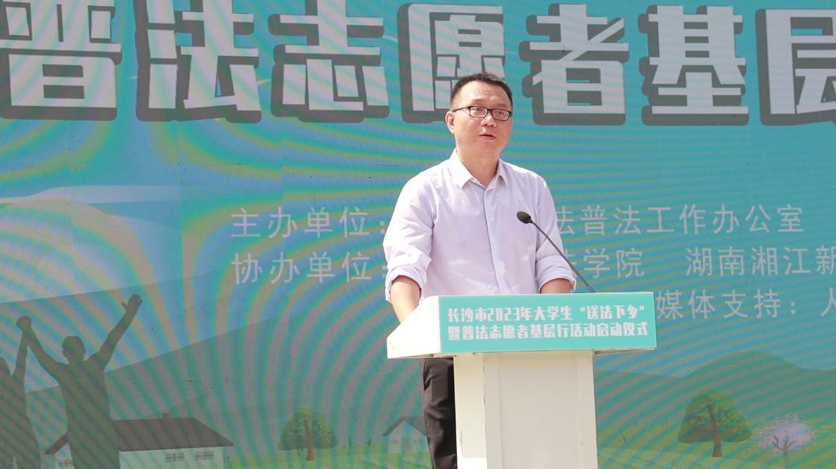 启动仪式上,湖南湘江新区政法工作部部务委员赵赢致欢迎辞,长沙市司法局普法与依法治理处处长王文为大学生“送法下乡”志愿队代表授旗,长沙市司法局党组成员、副局长王剑讲话并宣布活动启动。