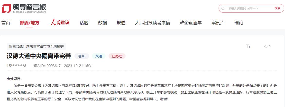 人民网长沙12月19日电 “可能由于设计的理念不同,导致中央隔离带的灯光遮挡隔离效果几乎为0,晚上开车很影响视线。”近日,一名网友在人民网“领导留言板”反映,自己经常往返于常德市区与汉寿县城之间,晚上开车驶入汉德大道的汉寿路段后,中央隔离带对向车道灯光的遮蔽效果很弱,加之该路段又是一条快行道,交通安全隐患大,建议完善汉德大道的中央隔离带。