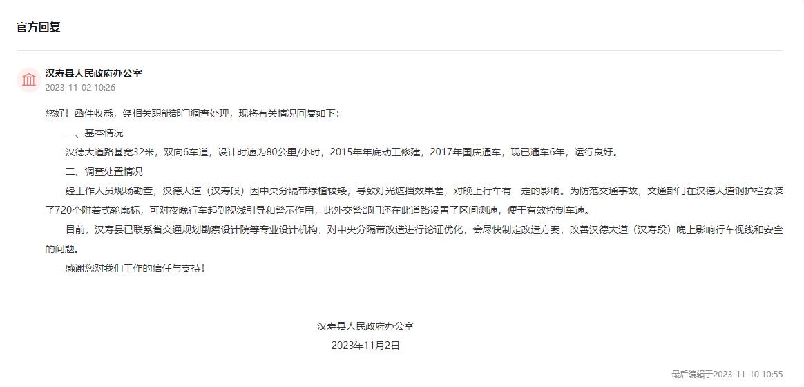 “目前,汉寿县已联系省交通规划勘察设计院等专业设计机构,对中央分隔带改造进行论证优化,会尽快制定改造方案,改善汉德大道(汉寿段)晚上影响行车视线和安全的问题。”汉寿县人民政府办公室在留言中回复道。(刘汕)