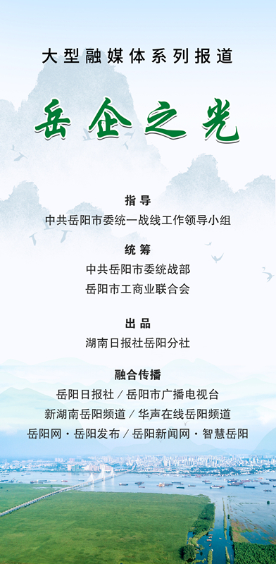 在中共岳阳市委统一战线工作领导小组指导下,岳阳市委统战部、岳阳市工商业联合会统筹,湖南日报社岳阳分社联合岳阳日报社、岳阳市广播电视台、新湖南岳阳频道、华声在线岳阳频道、岳阳网·岳阳发布、岳阳新闻网·智慧岳阳,重磅推出“岳企之光”大型融媒体系列报道,全方位、多视角、立体化呈现岳阳民营经济高质量发展的好声音好故事。敬请关注!