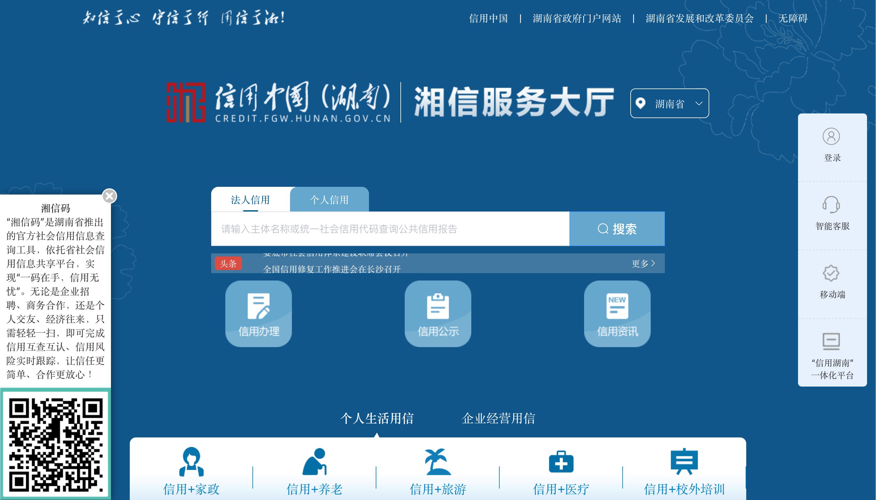 信用湖南一体化平台首页。网页截图
