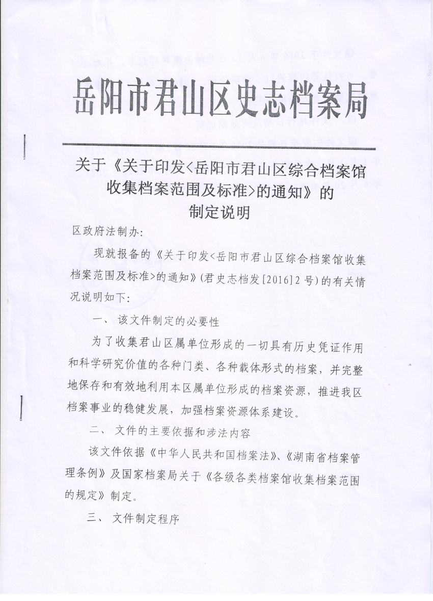 关于《岳阳市君山区综合档案馆收集档案范围及标准》的制定说明