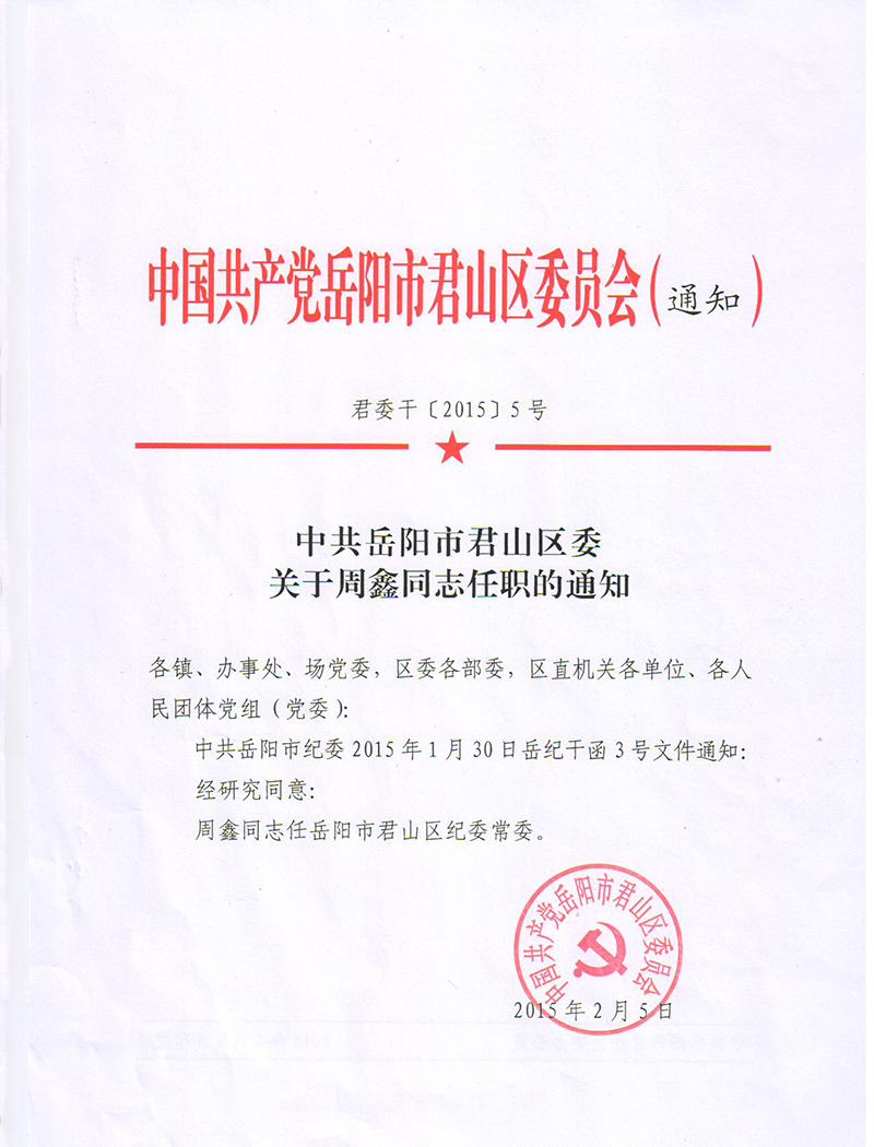 中共岳阳市君山区委关于周鑫同志任职的通知