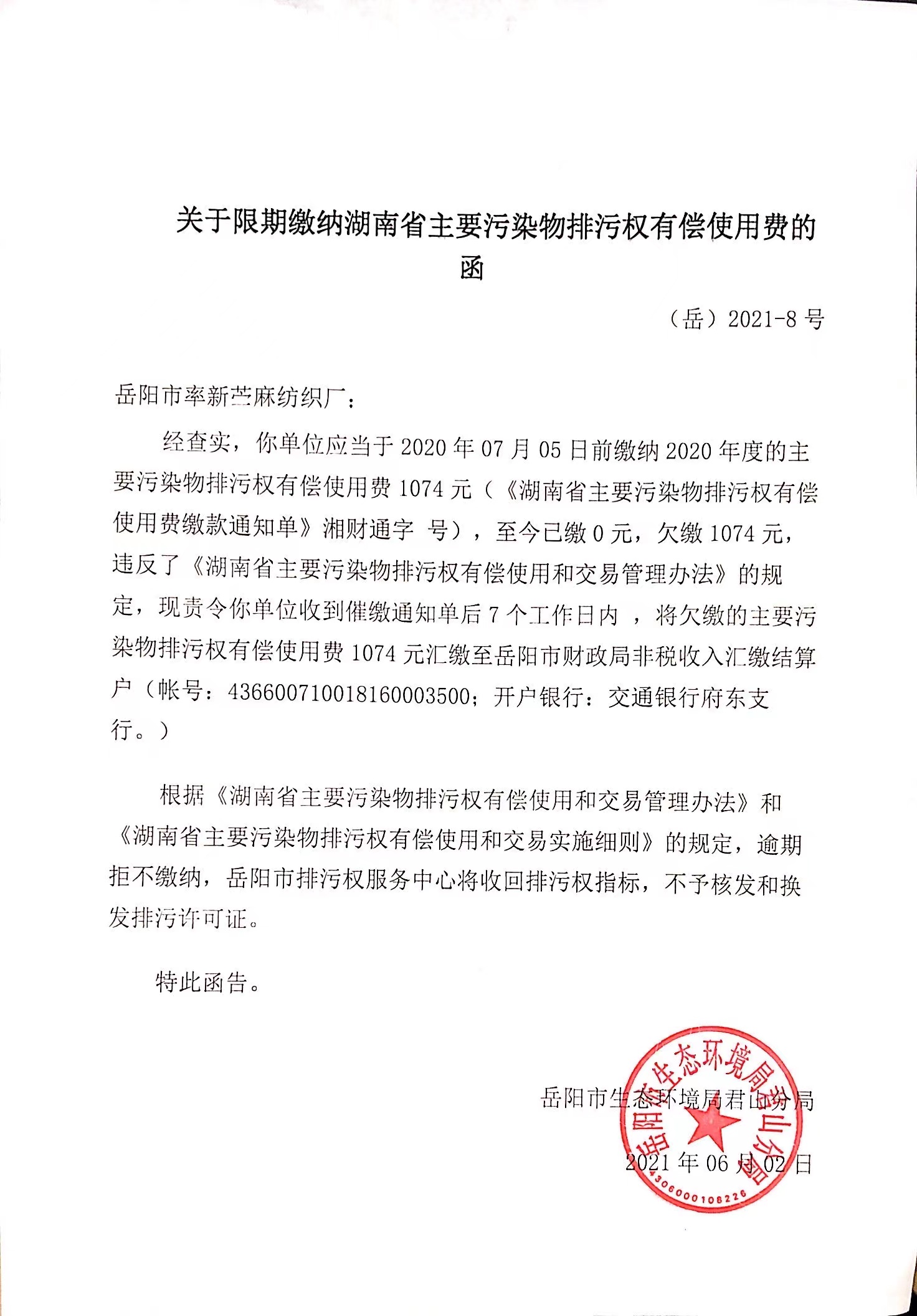 关于岳阳市率新苎麻纺织厂限期缴纳湖南省主要污染物排污权有偿使用费的函