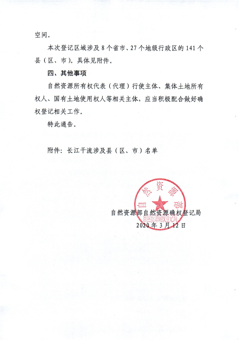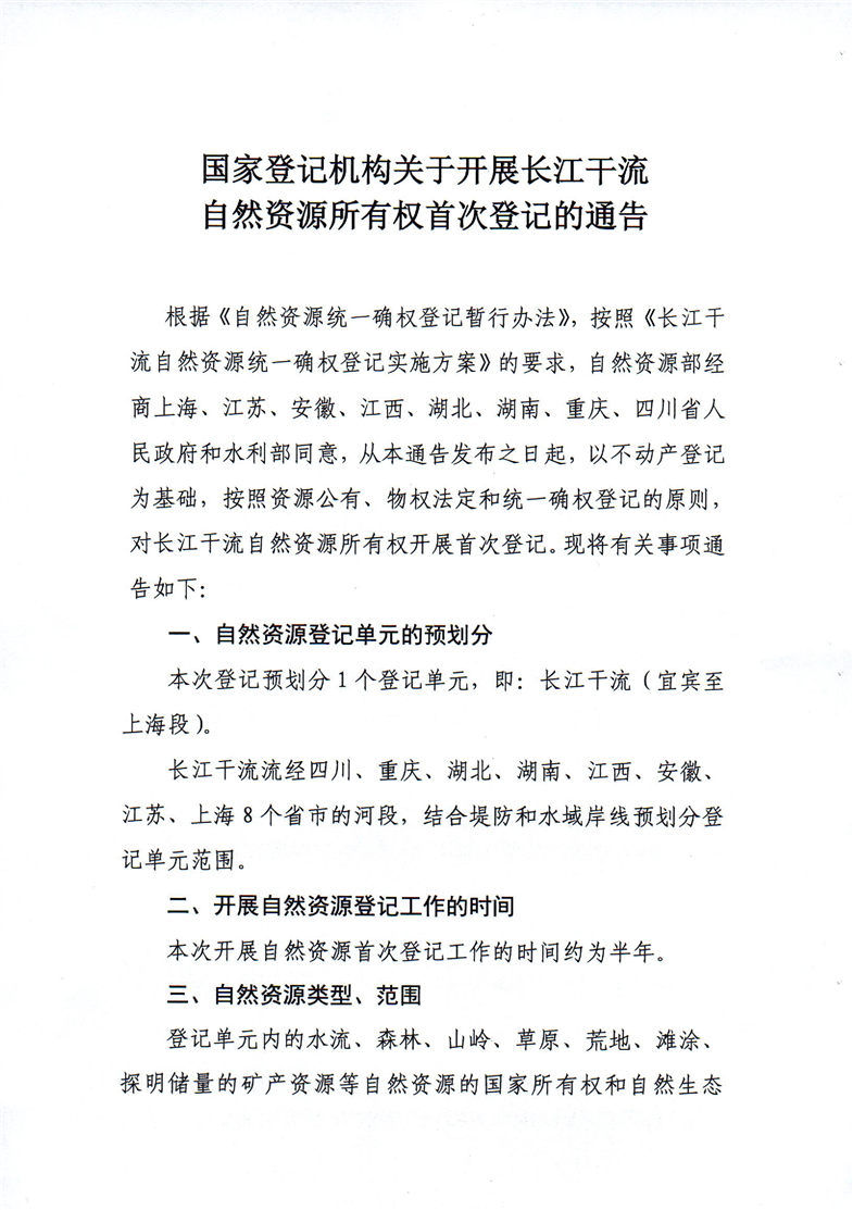 国家登记机构关于开展长江干流自然资源所有权首次登记的通告