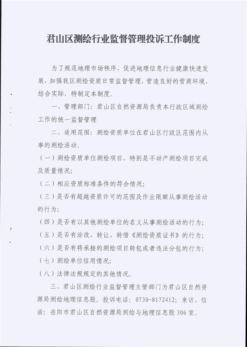 关于印发君山区测绘行业监督管理投诉工作制度的通知