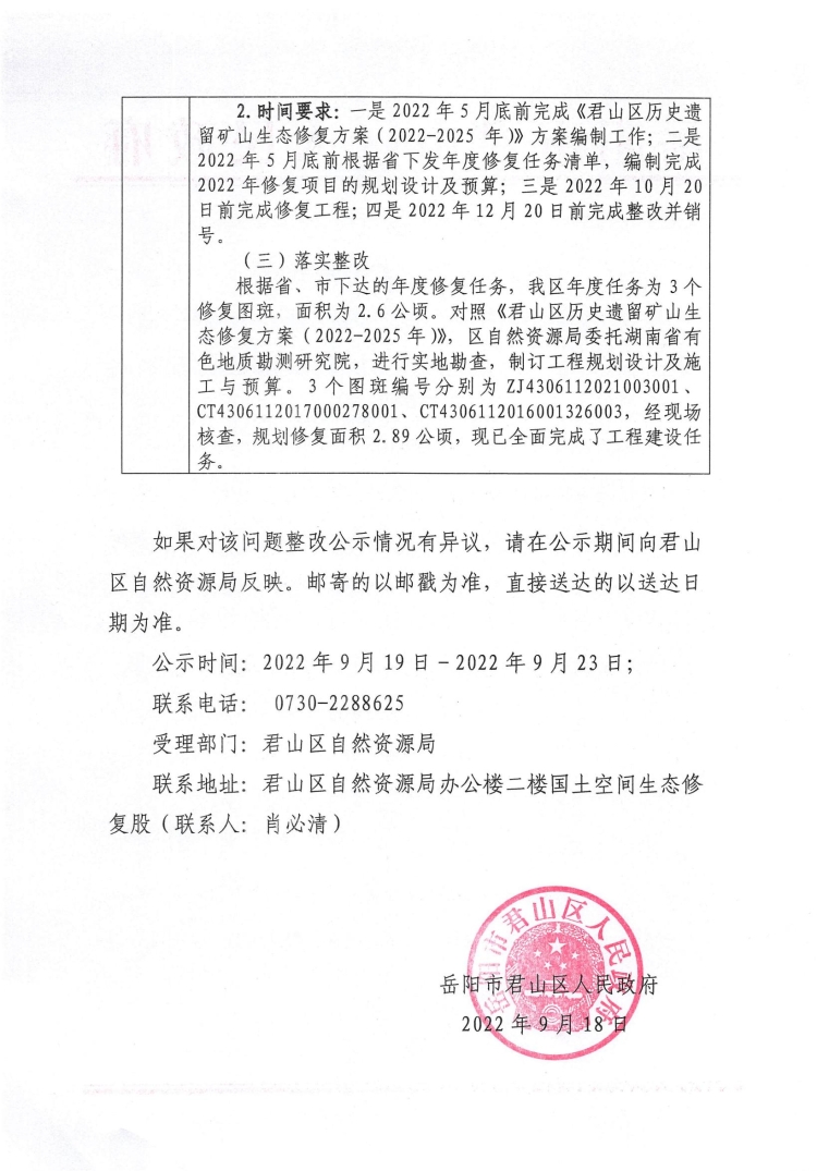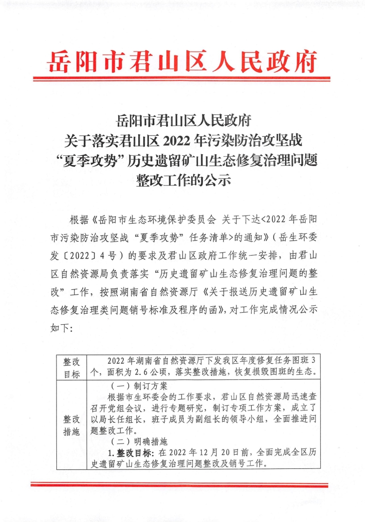关于落实君山区2022年污染防治攻坚战“夏季攻势”历史遗留矿山生态修复治理问题整改工作的公示