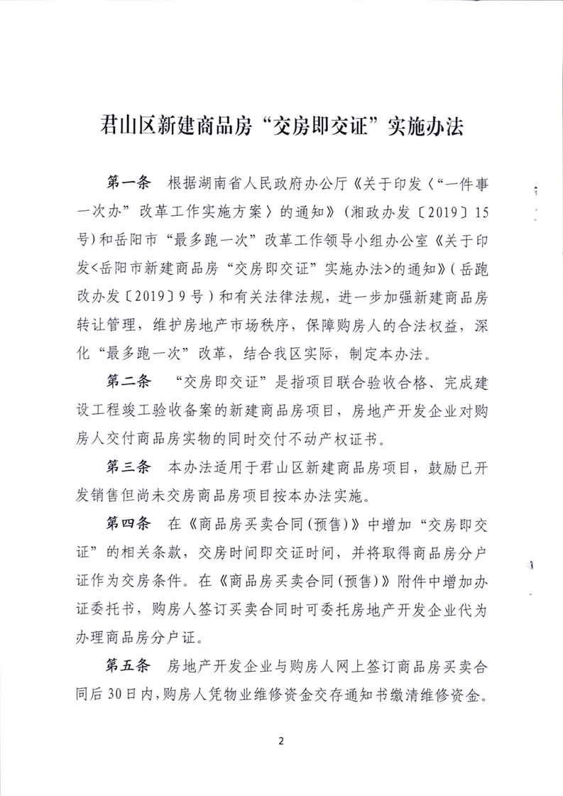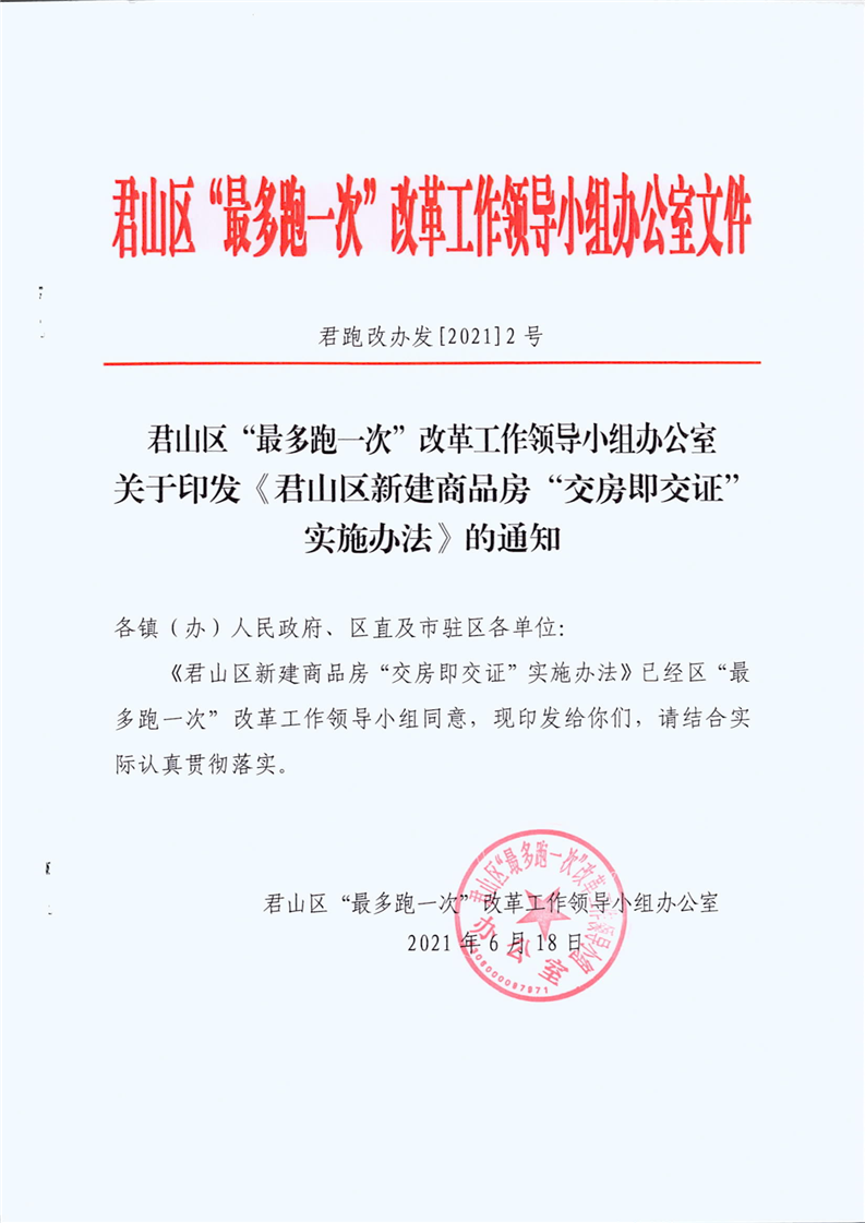 关于印发《君山区新建商品房“交房即交证”实施办法》的通知
