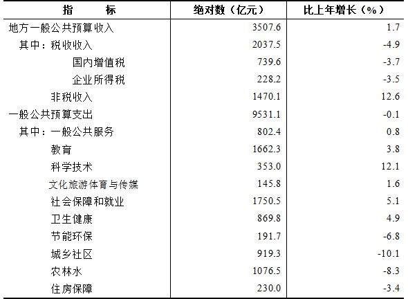 全年地方一般公共预算收入3507.6亿元,比上年增长1.7%。其中,税收收入2037.5亿元,下降4.9%;非税收入1470.1亿元,增长12.6%。税收收入中,国内增值税739.6亿元,下降3.7%;企业所得税228.2亿元,下降3.5%。一般公共预算支出9531.1亿元,下降0.1%。其中,教育支出1662.3亿元,增长3.8%;社会保障和就业支出1750.5亿元,增长5.1%;卫生健康支出869.8亿元,增长4.9%;科学技术支出353.0亿元,增长12.1%;住房保障支出230.0亿元,下降3.4%。