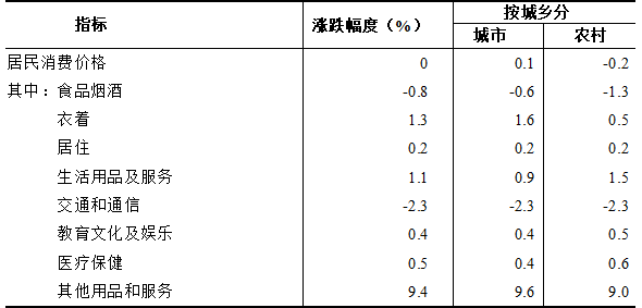 全省居民消费价格与上年持平。其中,城市上涨0.1%,农村下降0.2%。工业生产者出厂价格下降1.0%,工业生产者购进价格下降2.3%。农产品生产者价格下降5.7%。