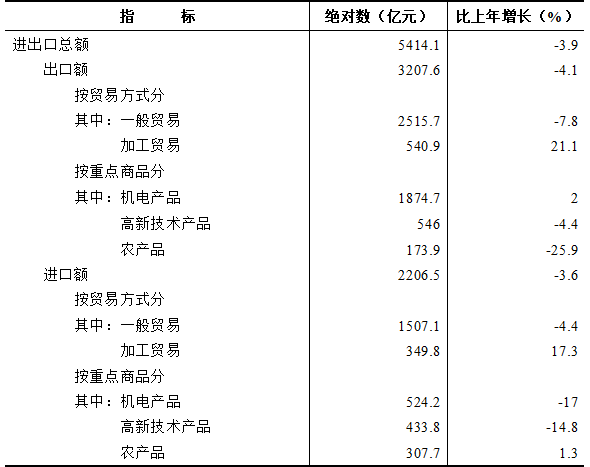 全年进出口总额5414.1亿元,比上年下降3.9%。其中,出口3207.6亿元,下降4.1%;进口2206.5亿元,下降3.6%。分贸易方式看,一般贸易出口2515.7亿元,下降7.8%;加工贸易出口540.9亿元,增长21.1%。重点出口商品中,机电产品1874.7亿元,增长2.0%;高新技术产品546.0亿元,下降4.4%。分产销国别(地区)看,出口美国222.7亿元,下降29.2%;出口中国香港455.9亿元,下降1.5%;出口欧盟[20]327.2亿元,增长0.4%;出口东盟632.8亿元,增长5.5%;出口共建“一带一路”国家1849.3亿元,下降2.1%。