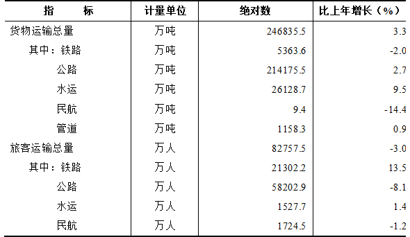 全年客货运输换算周转量4239.0亿吨公里,比上年增长1.9%。货物运输周转量[8]3170.2亿吨公里,增长1.7%。其中,铁路周转量892.2亿吨公里,增长0.5%;公路周转量1673.4亿吨公里,增长1.8%。旅客运输周转量1539.0亿人公里,增长1.9%。其中,铁路周转量1023.6亿人公里,增长2.4%;公路周转量[9]251.0亿人公里,下降5.2%;民航周转量262.3亿人公里,增长7.4%。