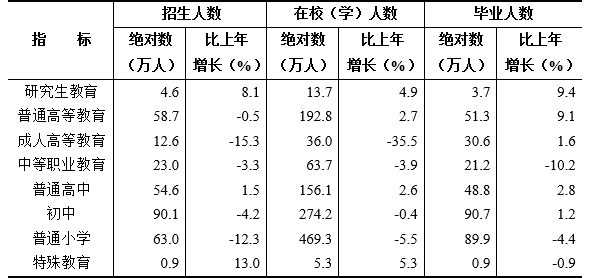 年末有普通高校147所。研究生教育毕业生3.7万人,普通高等教育毕业生51.3万人,中等职业教育[21]毕业生21.2万人,普通高中毕业生48.8万人,初中毕业生90.7万人,普通小学毕业生89.9万人。在园幼儿136.3万人,比上年末下降13.8%。小学适龄儿童入学率[22]100%。各类民办学校7934所,在校学生191.8万人。发放高校国家奖学金、助学金(本专科生)18.6亿元,资助高校学生(本专科生)86.2万人次。发放中职国家助学金7.8亿元,资助中职学生67.5万人次。落实义务教育保障资金110.8亿元,发放普通高中国家助学金6.4亿元。