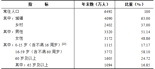 年末全省常住人口6492万人。其中,城镇人口4090万人,城镇化率63.0%,比上年末提高0.93个百分点。全年出生人口31.5万人,出生率4.83‰;死亡人口60.2万人,死亡率9.24‰;人口自然增长率-4.40‰。0-15岁(含不满16周岁)人口占常住人口的比重为17.17%,下降0.89个百分点;16-59岁(含不满60周岁)人口比重为58.10%,下降0.35个百分点;60岁及以上人口比重为24.72%,提高1.23个百分点。