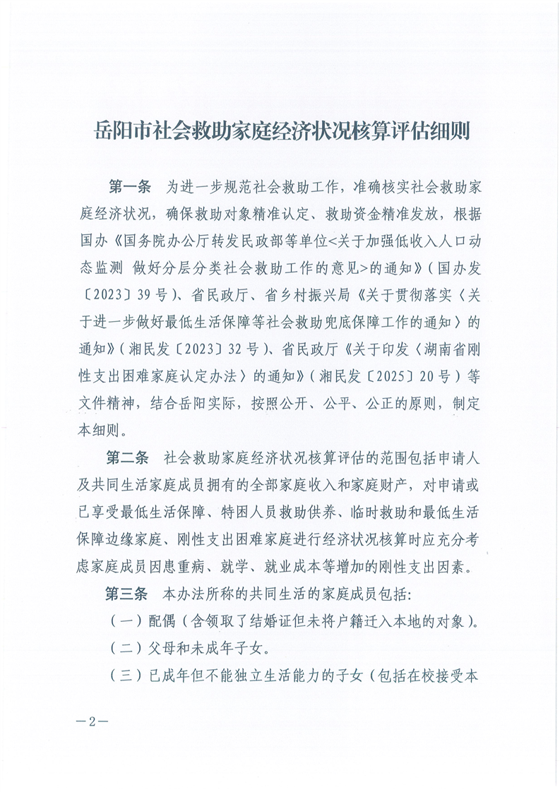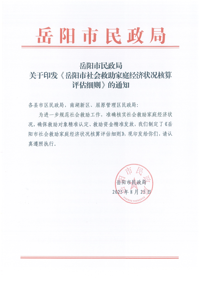 转发岳阳市民政局关于印发《岳阳市社会救助家庭经济核算评估细则》的通知