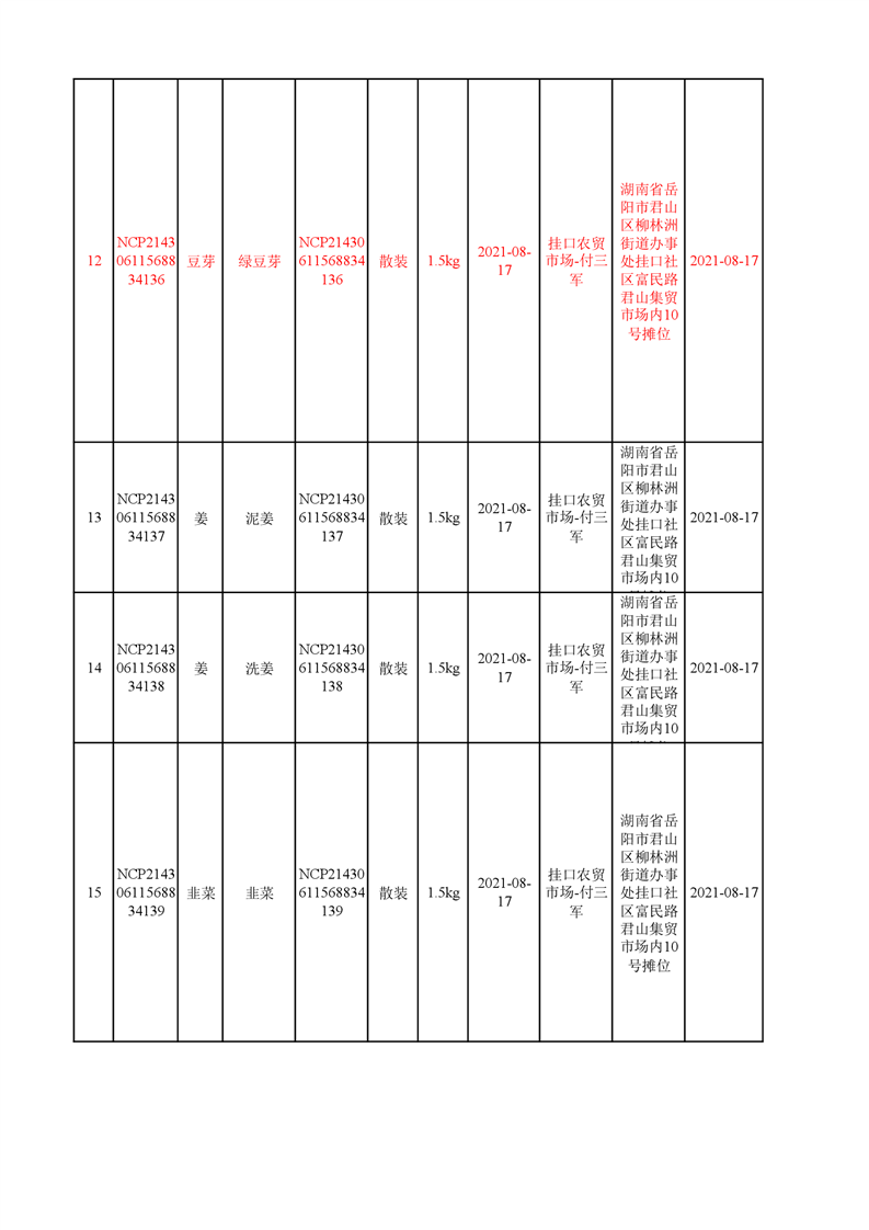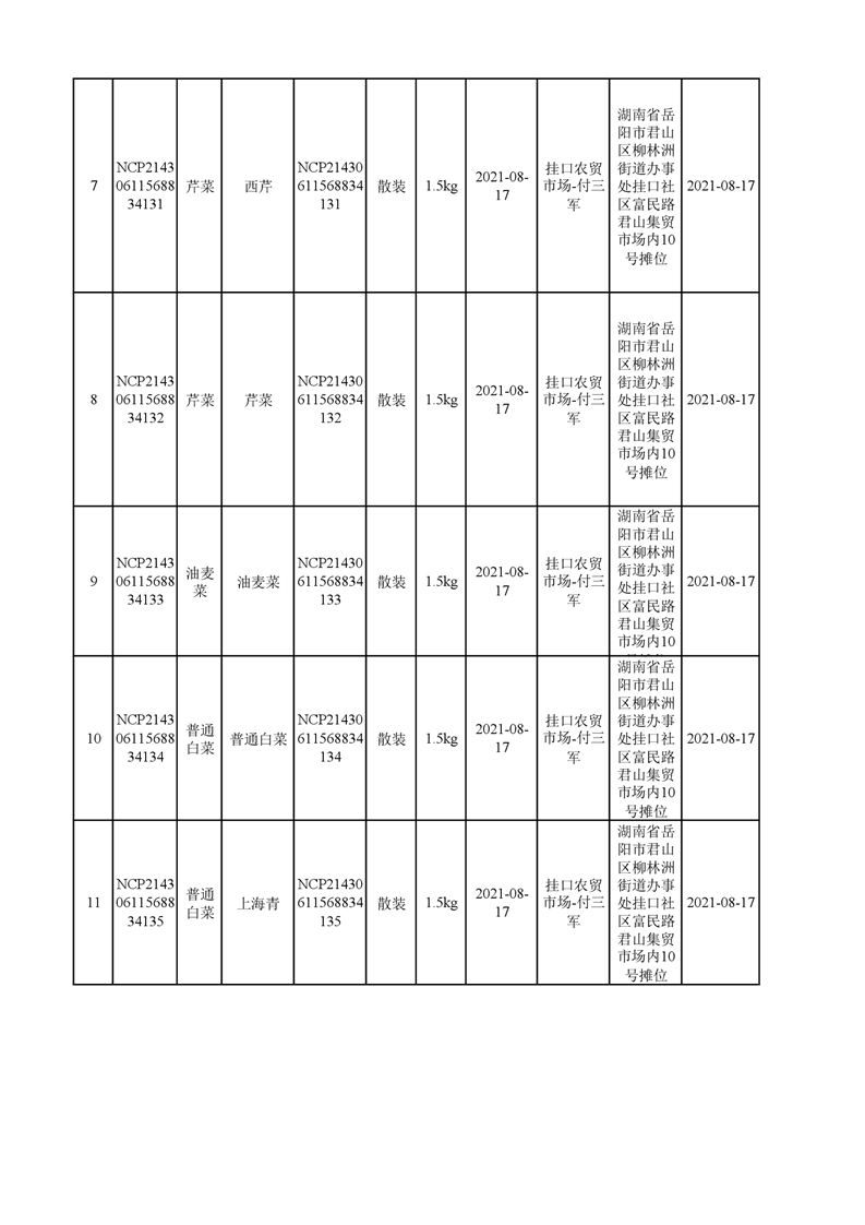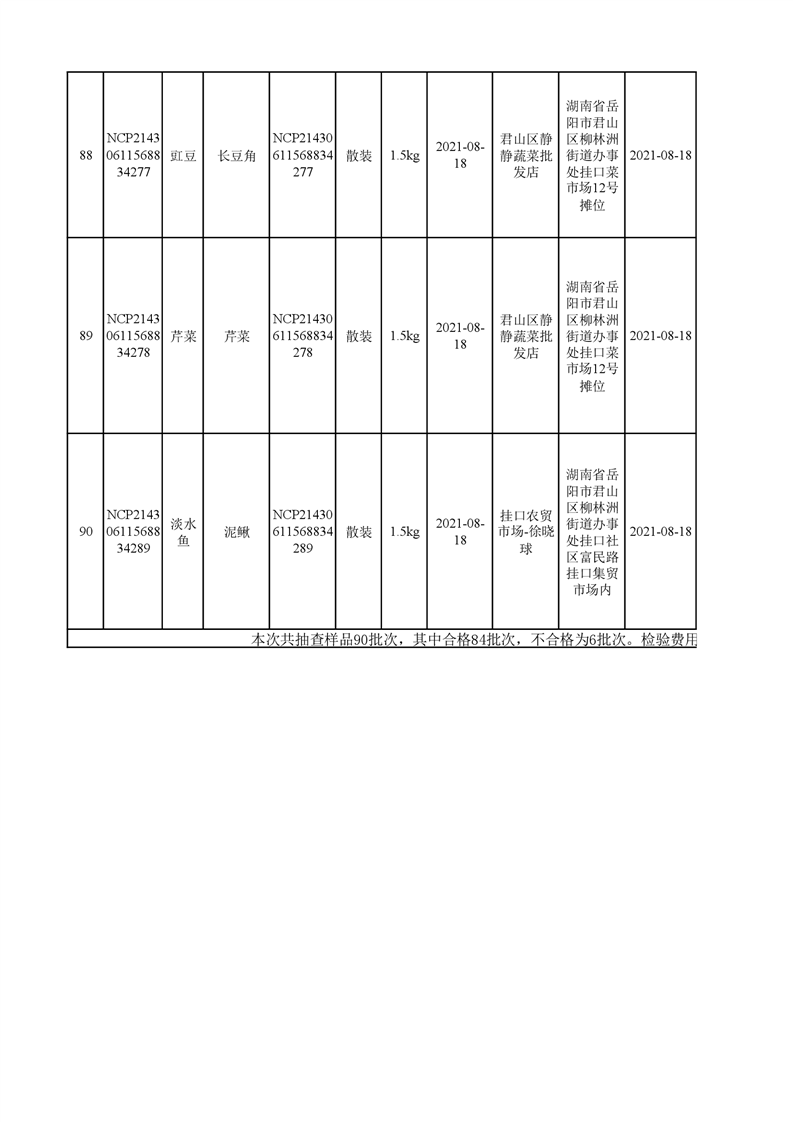 君山区市场监督管理局食品检验结果公示(食用农产品90批次)