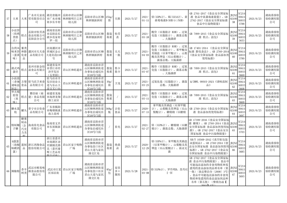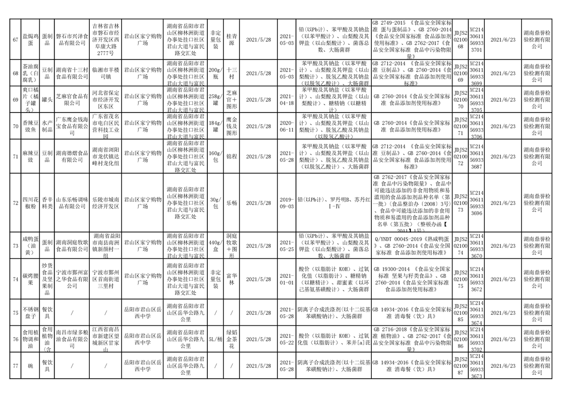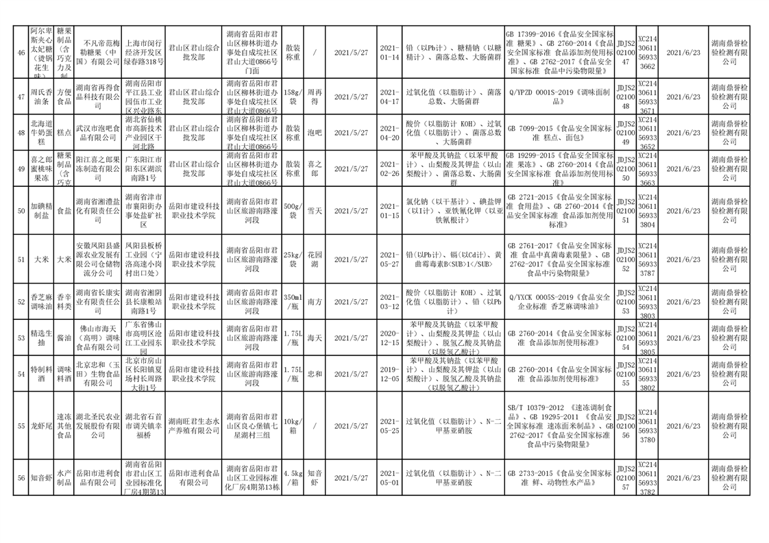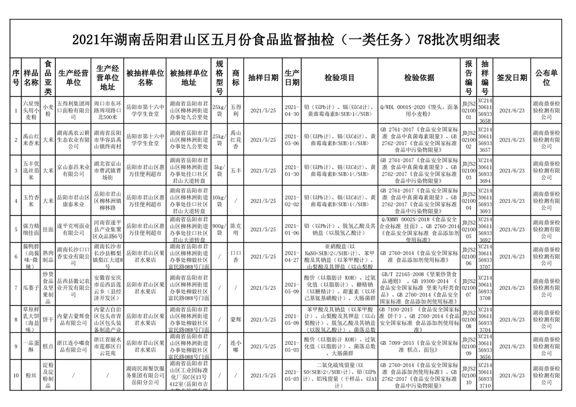 2021年湖南岳阳君山区五月份食品监督抽检(一类任务)82批次明细表