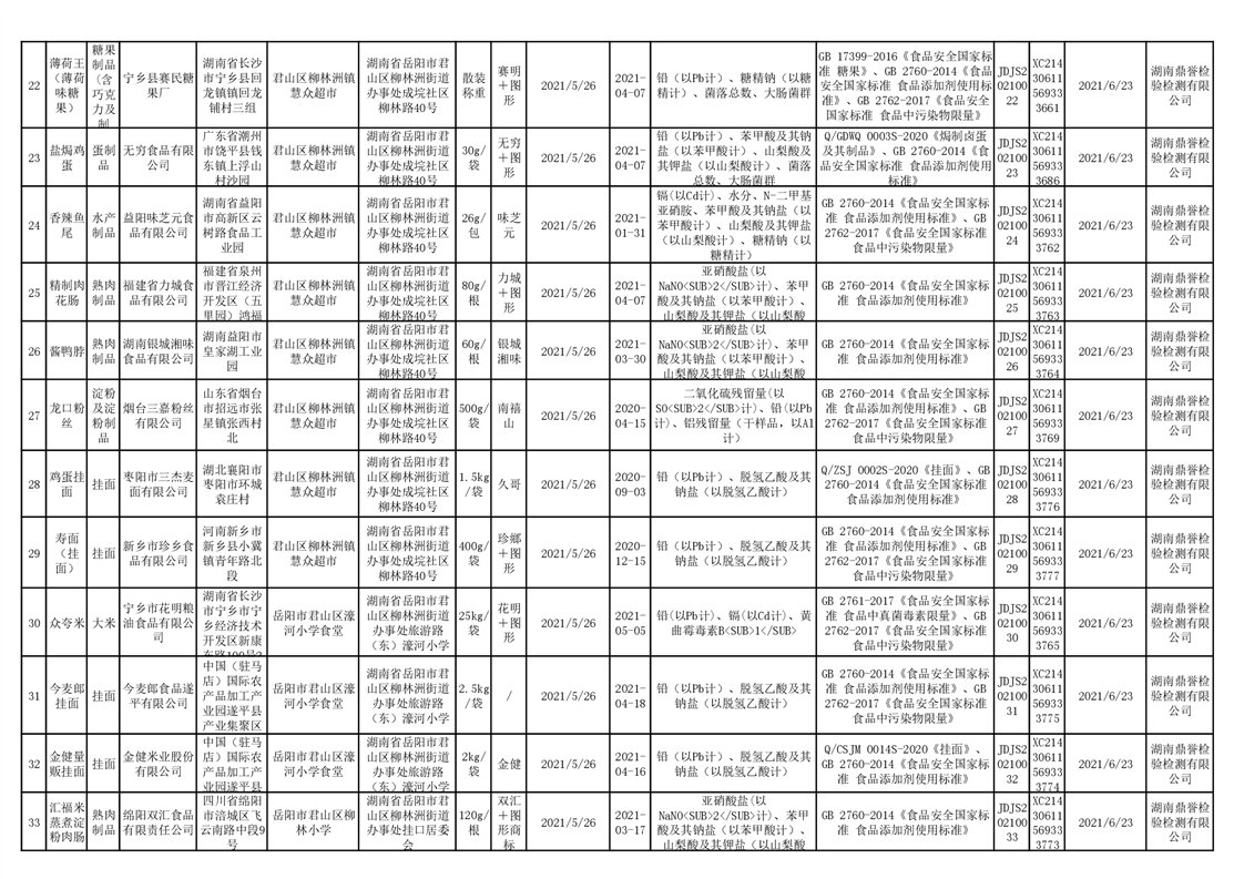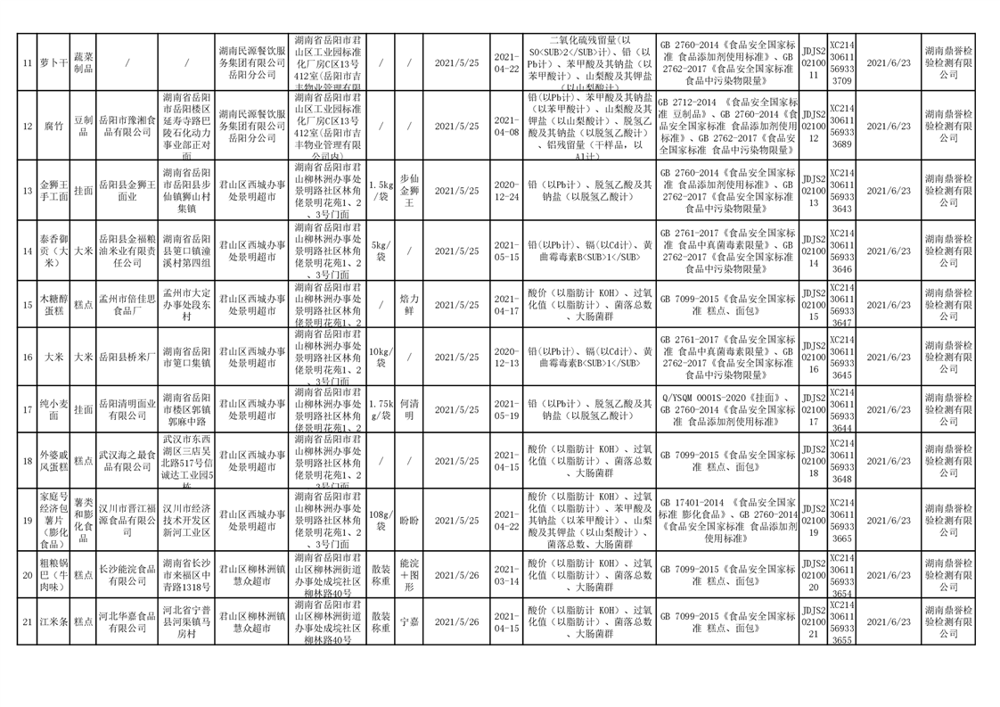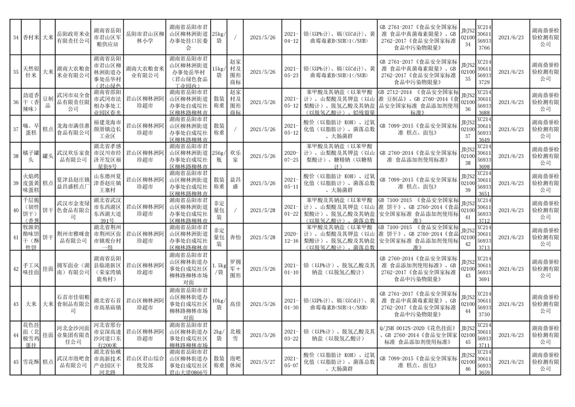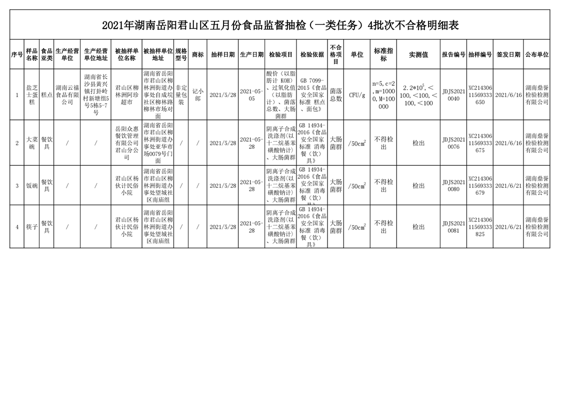 2021年湖南岳阳君山区五月份食品监督抽检(一类任务)82批次明细表