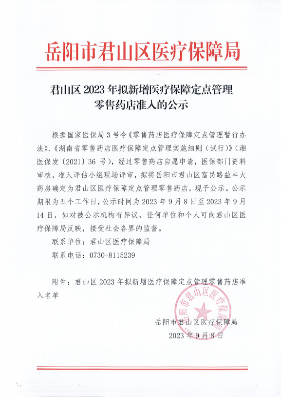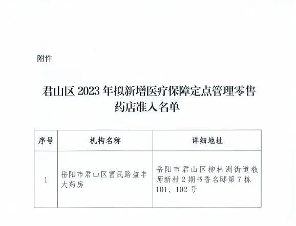 君山区2023年拟新增医疗保障定点管理零售药店准入的公示