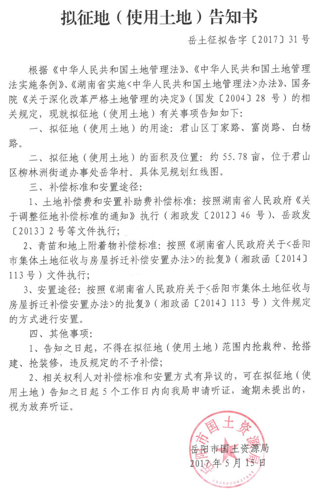 岳阳市国土资源局拟征地告知书|岳土征拟告字〔2017〕31号