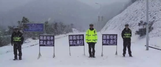 “道路结冰,禁止通行”、“雨雪天气、减速慢行”……警察站立在积雪路面的马路中央,用身体铸立起一条条平安路。他们说:“我们站在马路中央,对你的警告,是最安全的忠告!”