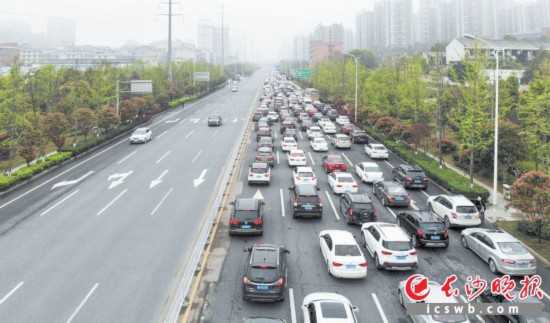 昨日是清明小长假第一天,出城通道车流量增大。上午,云栖路东往西方向车辆排起了长队,与进城车道形成鲜明对比。 长沙晚报全媒体记者 邹麟 摄